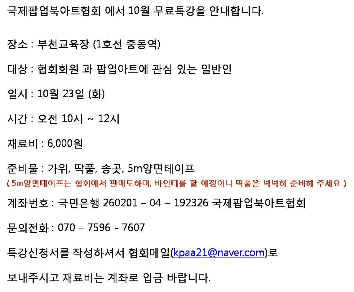 10월 무료특강 안내 페이지 정보 작성자 최고관리자 댓글 0건 조회 2,870회 작성일 12-09-27 12:04 본문 첨부파일 국제팝업북아트협회 특강신청서.doc (59.0K) 19회 다운로드 | DATE : 2012-09-27 12:04:59 목록 이전글11월 무료특강 " 임진왜란과 거북선 " 안내 12.10.22 다음글팝업역사 필 도서 "나는 팝업북에 탐닉한다." 필요하신 분~ 12.05.02 댓글목록 댓글목록 등록된 댓글이 없습니다.