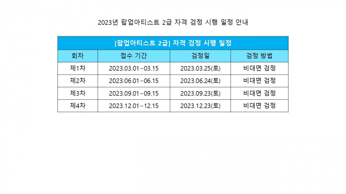 2023년 팝업아티스트 2급 자격 검정 시행 일정 안내 페이지 정보 작성자 관리자 댓글 0건 조회 1,756회 작성일 23-03-03 12:12 본문 2023년도 팝업아티스트 2급 자격 검정을 아래와 같이 시행합니다. 검정에 관한 자세한 사항은 검정 시행일 1개월 전에 세부 공지합니다. 목록 이전글2023년 팝업아티스트 1급 자격 검정 시행 일정 안내 23.03.03 다음글[교사모집] 홈스쿨 사업설명회 23.01.30 댓글목록 댓글목록 등록된 댓글이 없습니다.